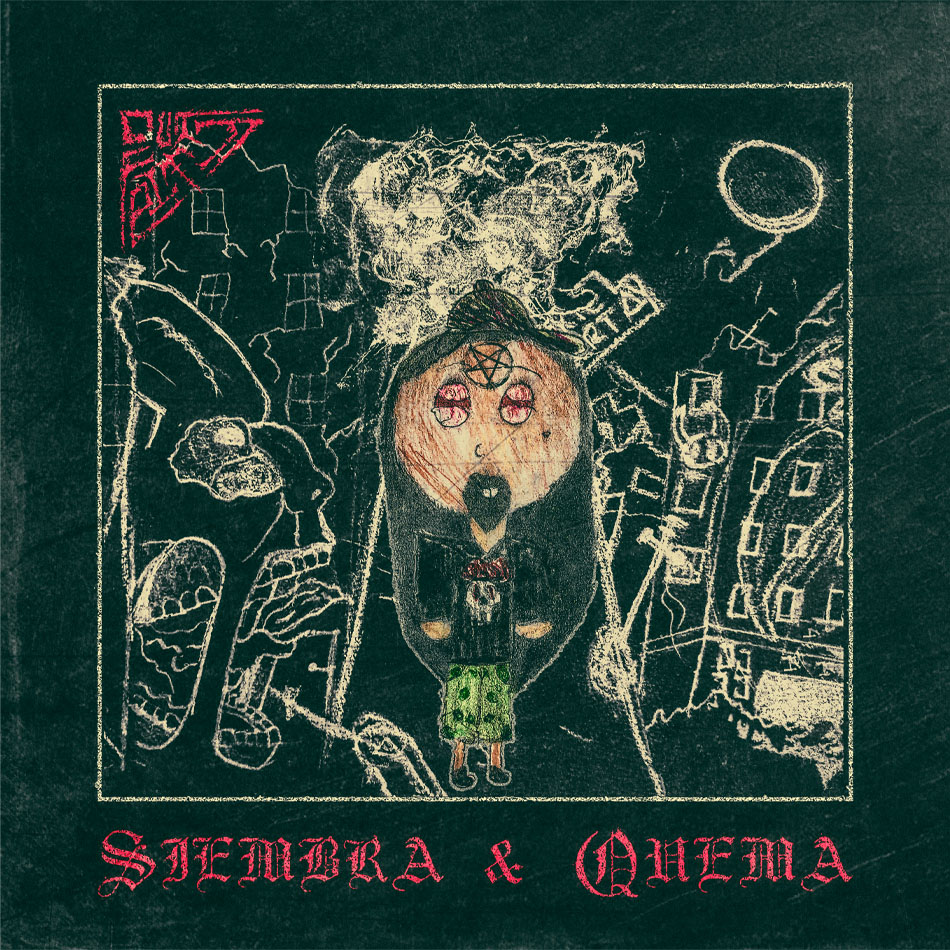 La portada de Siembra y Quema fue creada por Isabella Vidales, hija del bajista Anathema, quien aparece representado en la imagen, es un testimonio dividido en dos momentos de su vida. La figura central surge cuando Isabella tenía 6 años. Desde esa edad reconoce en su padre el consumo de cannabis, pero lo representa sin conflicto evidente. Hay aceptación, cercanía y una lectura emocional que no depende de normas externas. A los 16 años interviene el fondo. El entorno se convierte en un espacio colapsado: estructuras torcidas, figuras distorsionadas, trazos que recuerdan más a marcas que a dibujo. La escena cambia de sentido. Ya no se trata de entender al padre, sino de entender el mundo que lo rodea.